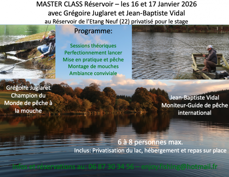 En début 2026, je propose une Master Class à mes stagiaires afin de leur faire bénéficier d'un stage très pointus sur les techniques de pêche à la mouche en réservoir. Qui dit réservoir, dit, pêche en eau close, donc lac, étang et plan d'eau.